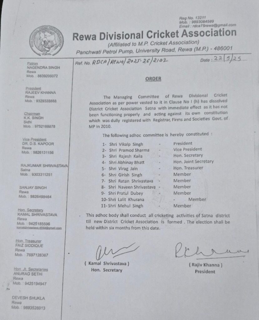रीवा डिवीजनल क्रिकेट एसोसिएशन (RDCA) ने बड़ा निर्णय लेते हुए सतना जिला क्रिकेट एसोसिएशन को तत्काल प्रभाव से भंग कर दिया है। वर्ष 2010 में पंजीकृत यह संस्था अपने संविधान के अनुरूप काम नहीं कर रही थी। आरडीसीए ने आदेश जारी कर जिले में क्रिकेट गतिविधियों के संचालन हेतु 11 सदस्यीय एडहॉक कमेटी का गठन किया है, जो अगले छह माह तक कार्य करेगी। इसके बाद नई जिला क्रिकेट एसोसिएशन का गठन कर चुनाव कराए जाएंगे।