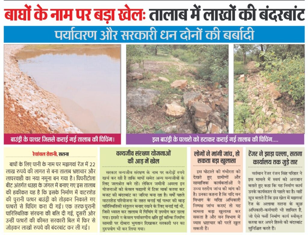 सतना | मझगवां वन परिक्षेत्र अंतर्गत पिपरी टोला के धउहा गांव में 22 लाख रुपए की लागत से निर्मित तालाब में गंभीर अनियमितता सामने आई है। बताया जा रहा है कि पीचिंग कार्य में मानक के विपरीत वाटरशेड योजना के पत्थरों का उपयोग किया गया, जिससे वन विभाग की कार्यप्रणाली पर सवाल उठने लगे हैं। बीट गार्ड सचिन मिश्रा, सर्किल प्रभारी रामकिशोर गोंड और तत्कालीन रेंजर पंकज दुबे इस कार्य के भुगतान के लिए तेजी से प्रयासरत हैं। आशंका है कि शिकायत होने पर न केवल भुगतान रुक सकता है, बल्कि संबंधित अधिकारियों पर कार्रवाई भी तय मानी जा रही है।