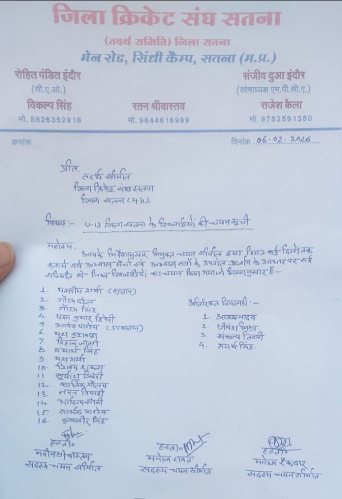 सतना। जिला क्रिकेट संघ सतना (तदर्थ समिति) द्वारा घोषित अंडर-13 टीम गुरुवार को प्रतियोगिता में भाग लेने के लिए रीवा रवाना होगी। खिलाड़ियों के ठहरने की व्यवस्था होटल स्टार में की गई है। संघ द्वारा जारी कार्यक्रम के अनुसार सभी खिलाड़ियों को सुबह 9 बजे एमपीसीए मैदान, सिरमौर रोड रीवा में उपस्थित होना होगा, जहां से प्रतियोगिता की औपचारिक शुरुआत होगी,