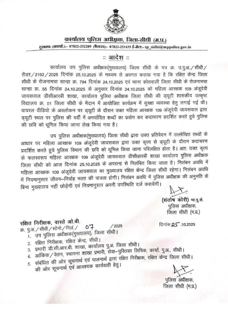 वीडियो में आरक्षक को वर्दी में एक ब्राह्मण व्यक्ति के प्रति अपमानजनक भाषा का प्रयोग करते देखा गया था। इस पर एसपी सीधी ने त्वरित कार्रवाई करते हुए महिला आरक्षक अंजू जायसवाल को तत्काल प्रभाव से निलंबित कर दिया है।