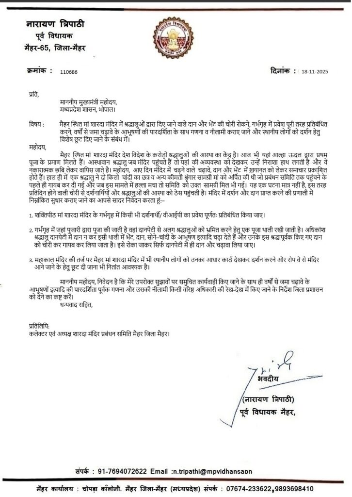 मैहर। बीते दिनों मां शारदा मंदिर में चढ़ावे की चोरी और दान–भेंट के गायब होने की लगातार आ रही शिकायतों के बाद पूर्व विधायक नारायण त्रिपाठी ने मुख्यमंत्री को पत्र लिखकर बड़ी कार्रवाई की मांग की है। उन्होंने मंदिर परिसर में बढ़ रही अव्यवस्था, दान की सुरक्षा में लापरवाही और गर्भगृह में अनियंत्रित आवाजाही को श्रद्धालुओं की आस्था पर आघात बताते हुए त्वरित हस्तक्षेप की अपील की है।
