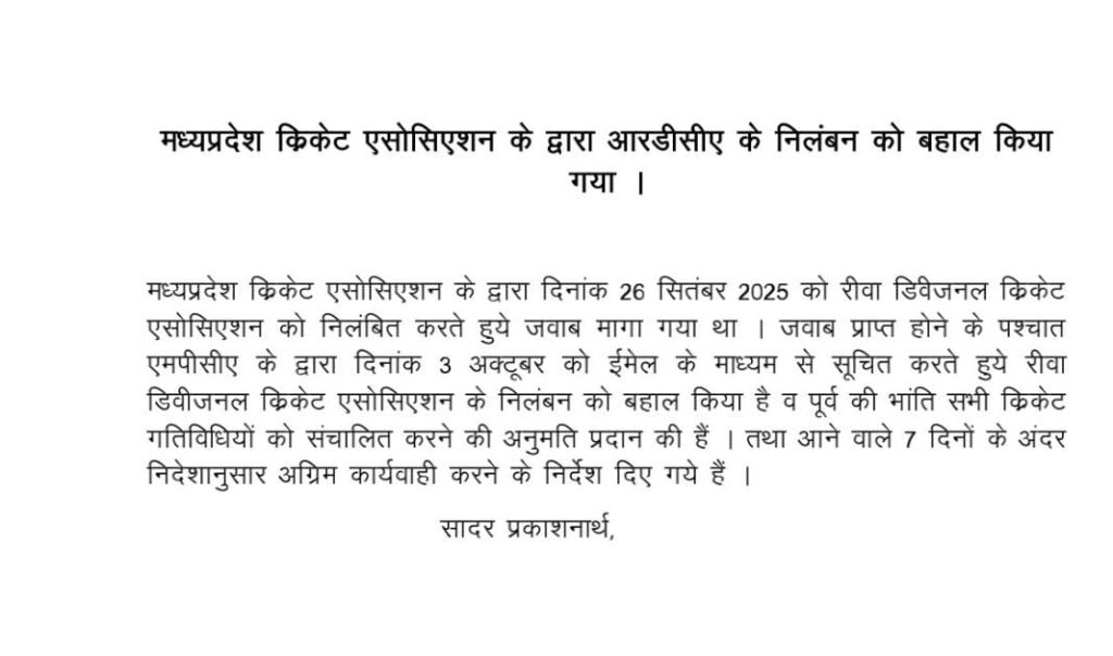 एमपीसीए ने रीवा डिवीजनल क्रिकेट एसोसिएशन का निलंबन समाप्त कर दिया है।
