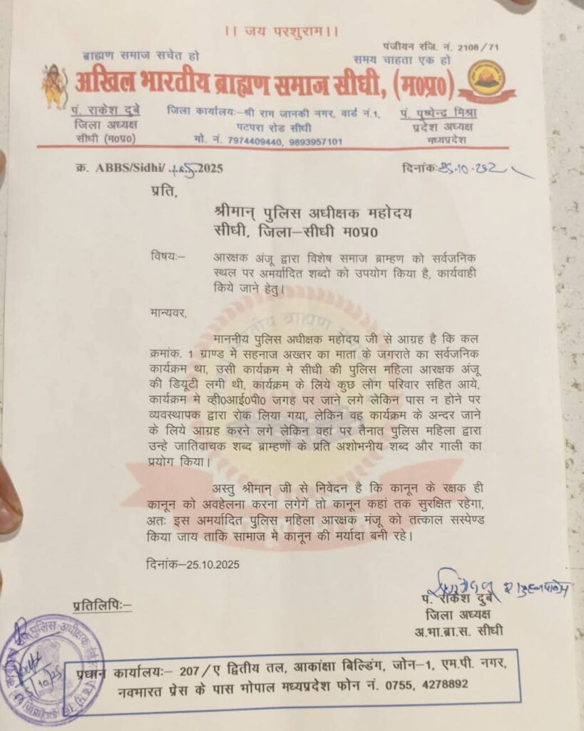 सीधी में महिला आरक्षक के ‘पंडिताई’ पर कहे अपशब्दों से भड़का ब्राह्मण समाज, बर्खास्तगी की मांग तेज, रीवा-सतना से भोपाल तक आक्रोश की लहर….