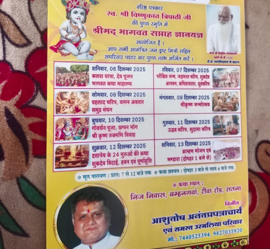 सतना। जिले के वरिष्ठ, सरल स्वभाव और सर्वप्रिय पत्रकार स्वर्गीय विष्णु कांत त्रिपाठी की अमर स्मृति में श्रीमद् भागवत ज्ञानयज्ञ का आयोजन किया जा रहा है,